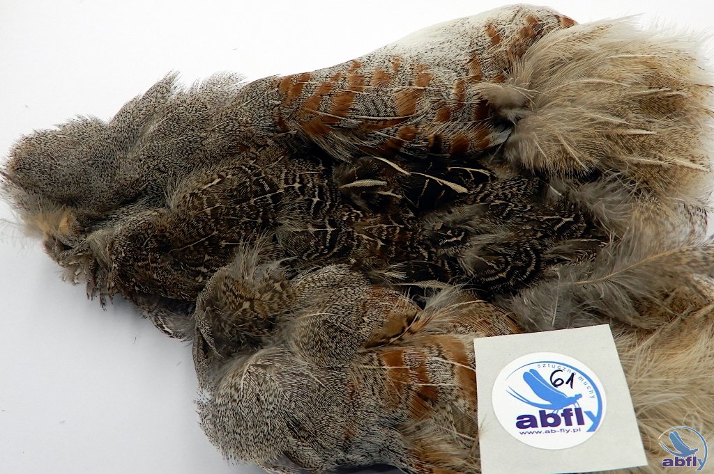 Pióra kuropatwy to bardzo popularny materiał używany do wykonania sztucznych much. Pióra szyjne i grzbietowe wykorzystane mogą być do każdego rodzaju much. Jest to podstawowy materiał dla każdego wiązacza much. Do skóry dołożony komplet skrzydeł kuropatwy.