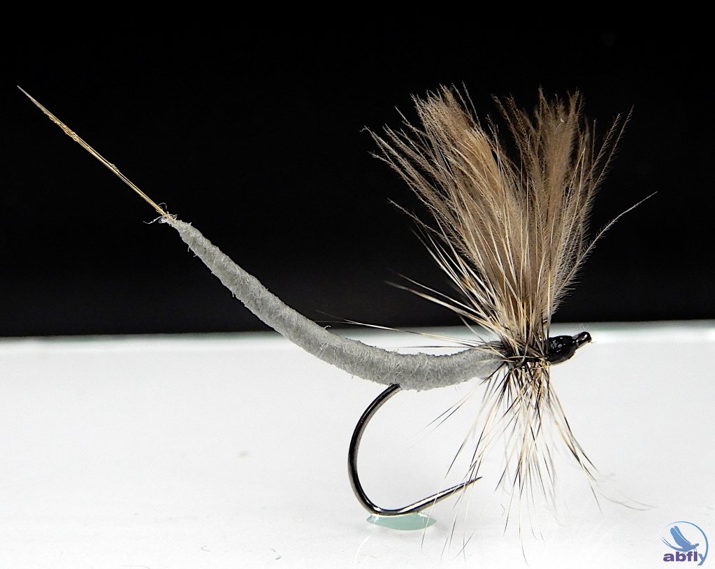 Hak WD406BL, tułów jętki wykonany z materiału tube body may fly firmy Hemingway`s w kolorze szarym (djetinja river) Mucha ta bardzo dobrze się sprawdza podczas wiosennych rójek march brown.