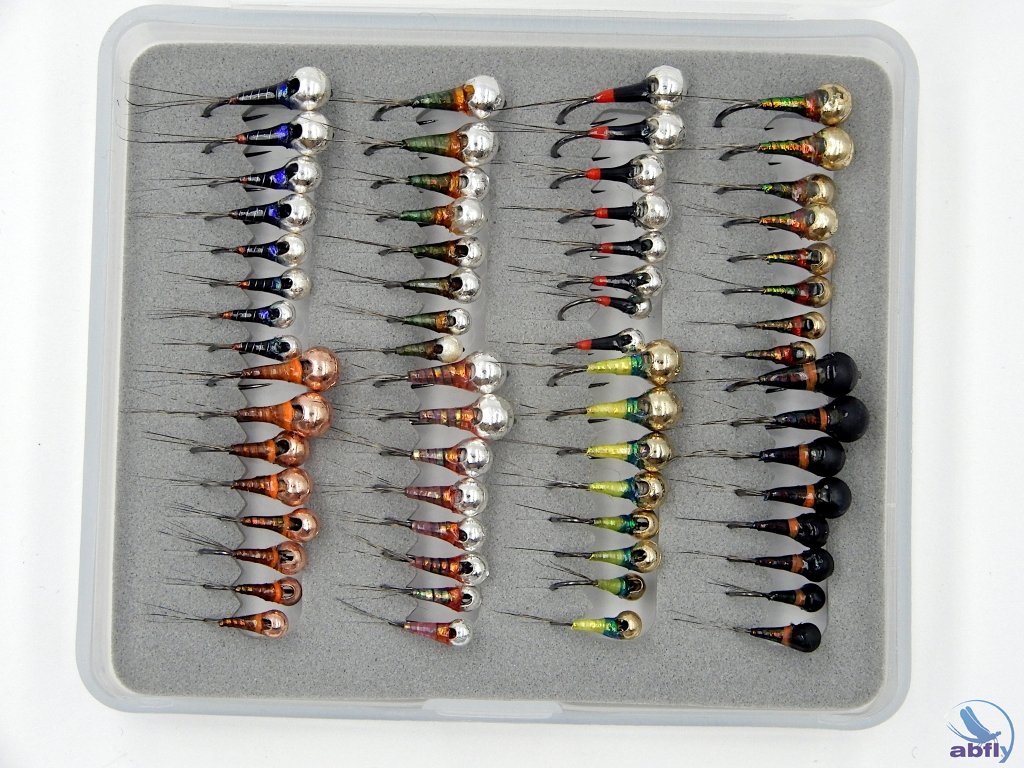 Zestaw 64szt. nimf- perdigonów na hakach #14, #16. Idealny zestaw na prezent dla wędkarza muchowego.